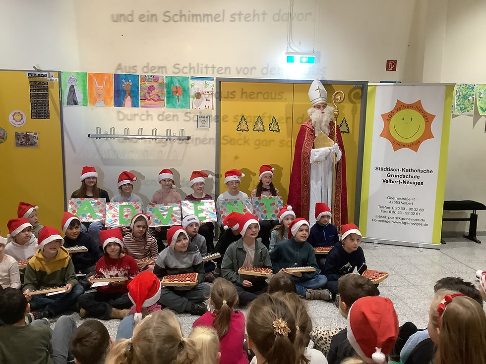Mit großer Vorfreude und fröhlichem Gesang empfingen die Kinder der Katholischen Sonnenschule am Montagmorgen den heiligen Bischof Nikolaus. Zum bekannten Lied „Lasst uns froh und munter sein“, begleitet von Glockenspielen der Schülerinnen und Schüler des 3. Schuljahres, zog der Heilige feierlich in die festlich geschmückte Aula ein.
