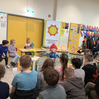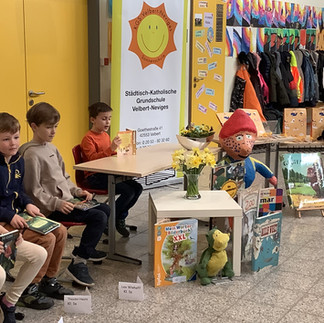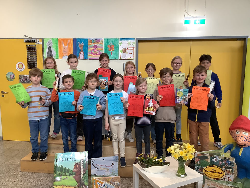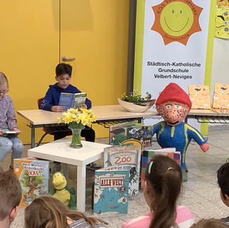In der 3. Schulstunde kamen die Kinder der Jahrgänge 1 und 2 zusammen. Beim gemeinsamen Singen wurden die jüngeren Kinder von den „Großen“, den Schmetterlings- und Seepferdchenkindern, unterstützt. Eine Jury aus engagierten Eltern übernahm die Bewertung der Vorlesebeiträge.
