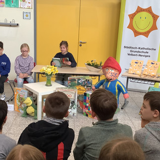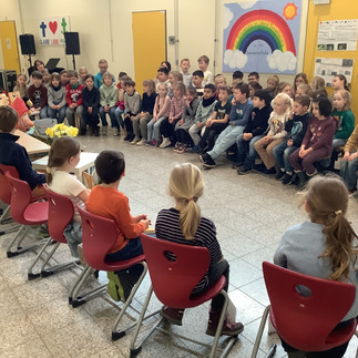 Am 17. März war es dann endlich so weit: Um 9.00 Uhr eröffnete das Lied „Lesen heißt auf Wolken liegen“ den Lesewettbewerb in der Aula der Sonnenschule. Die Kinder der Jahrgänge 3 und 4 versammelten sich, um ihre Favoritinnen und Favoriten anzufeuern und gespannt den vorgetragenen Geschichten zu lauschen.